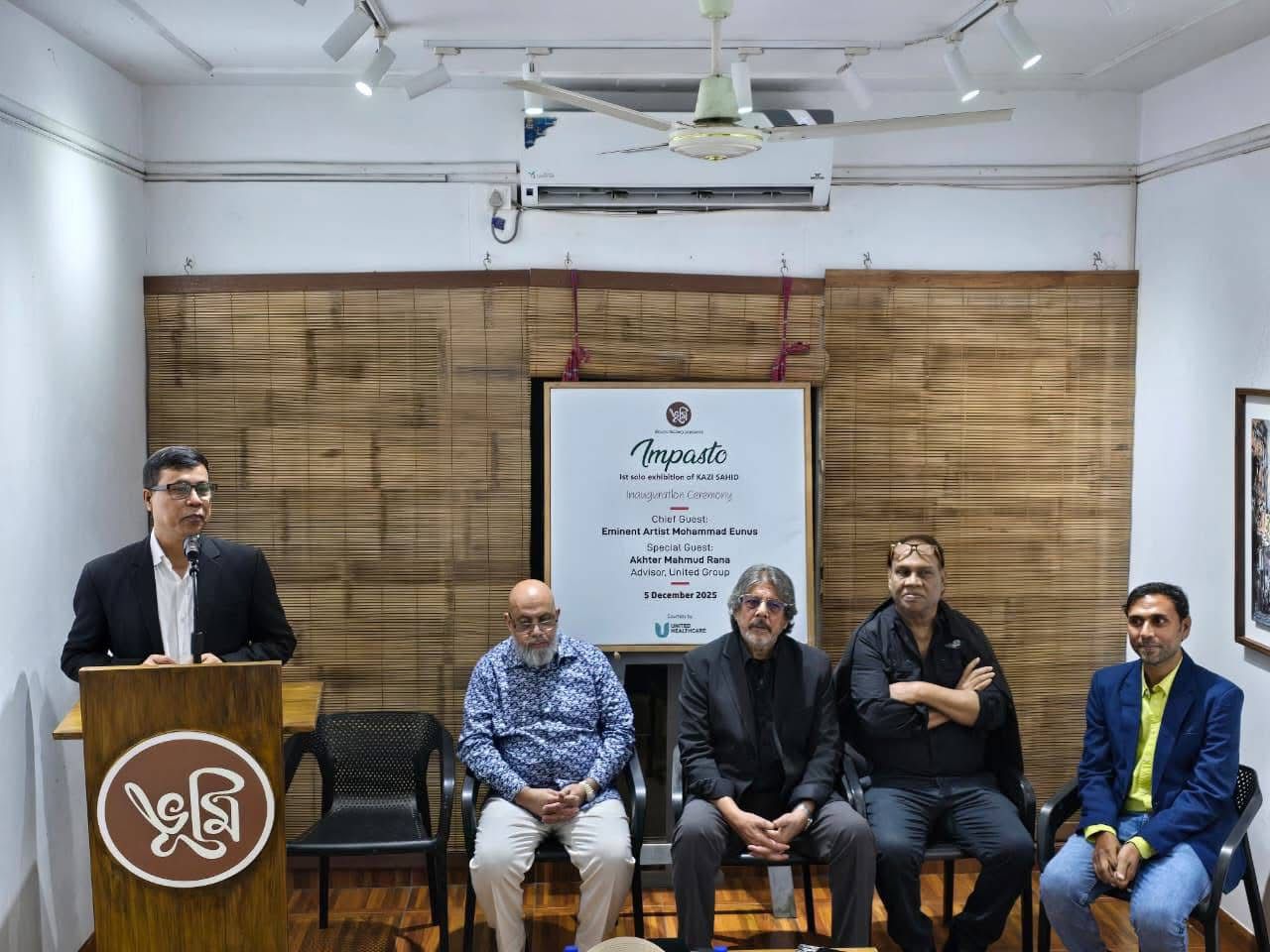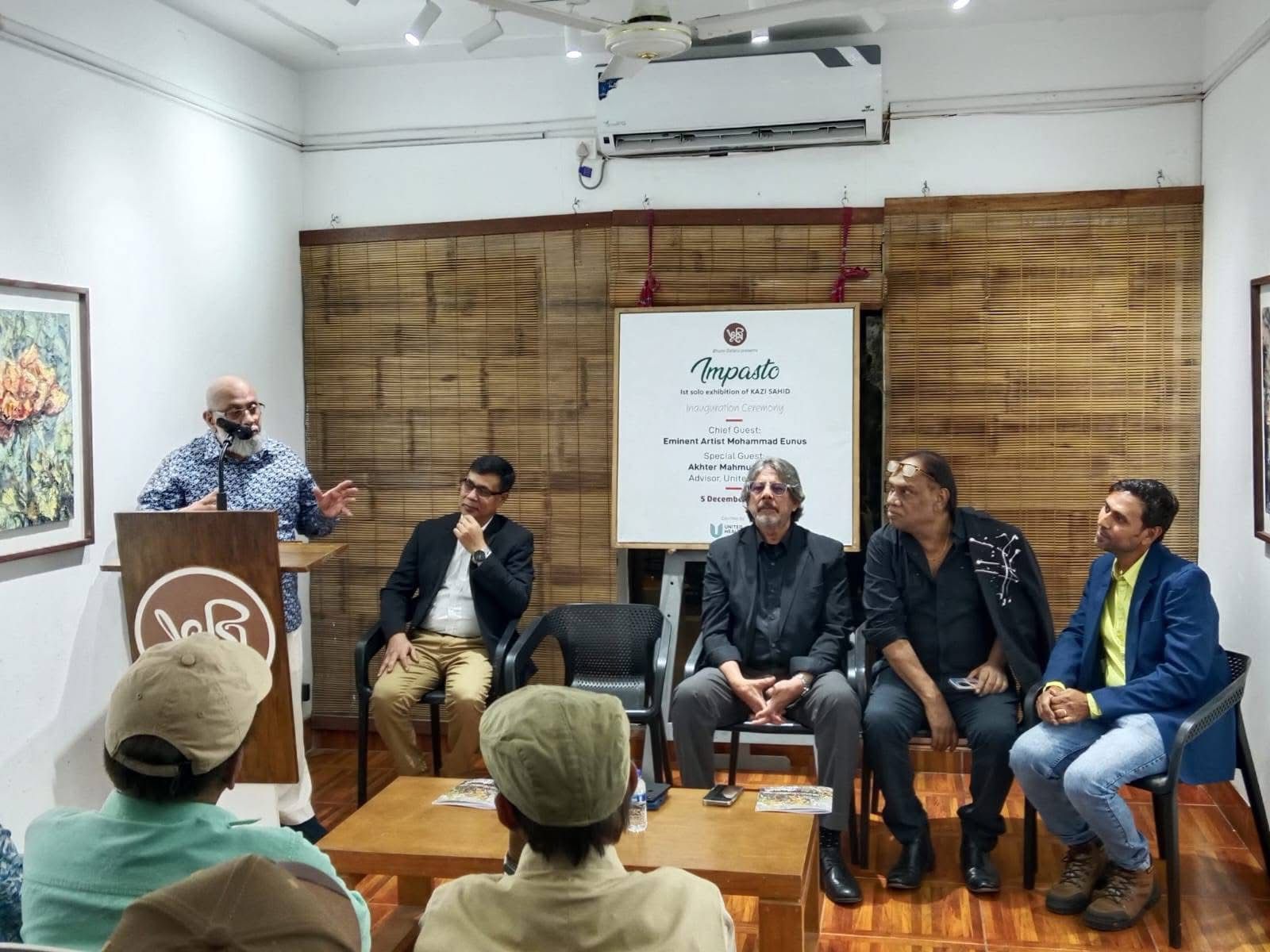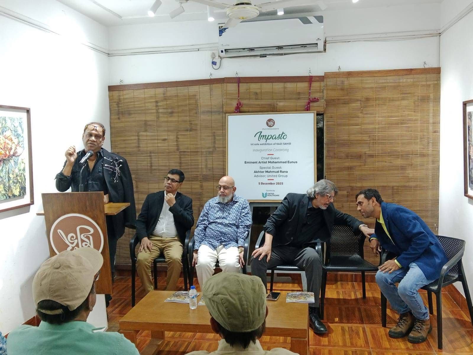 By the initiative of Bhumi Gallery, on Friday evening, December 5, 2025, the inaugural ceremony of “Impasto,” the first solo painting exhibition by the bold and talented contemporary artist Sahid Kazi, was organized. The event took place at Bhumi Gallery in Lalmatia, with the eminent painter Mohammad Eunus attending as the chief guest, and renowned artist Jamal Ahmed and United Group advisor Akhter Mahmud Rana attending as special guests.