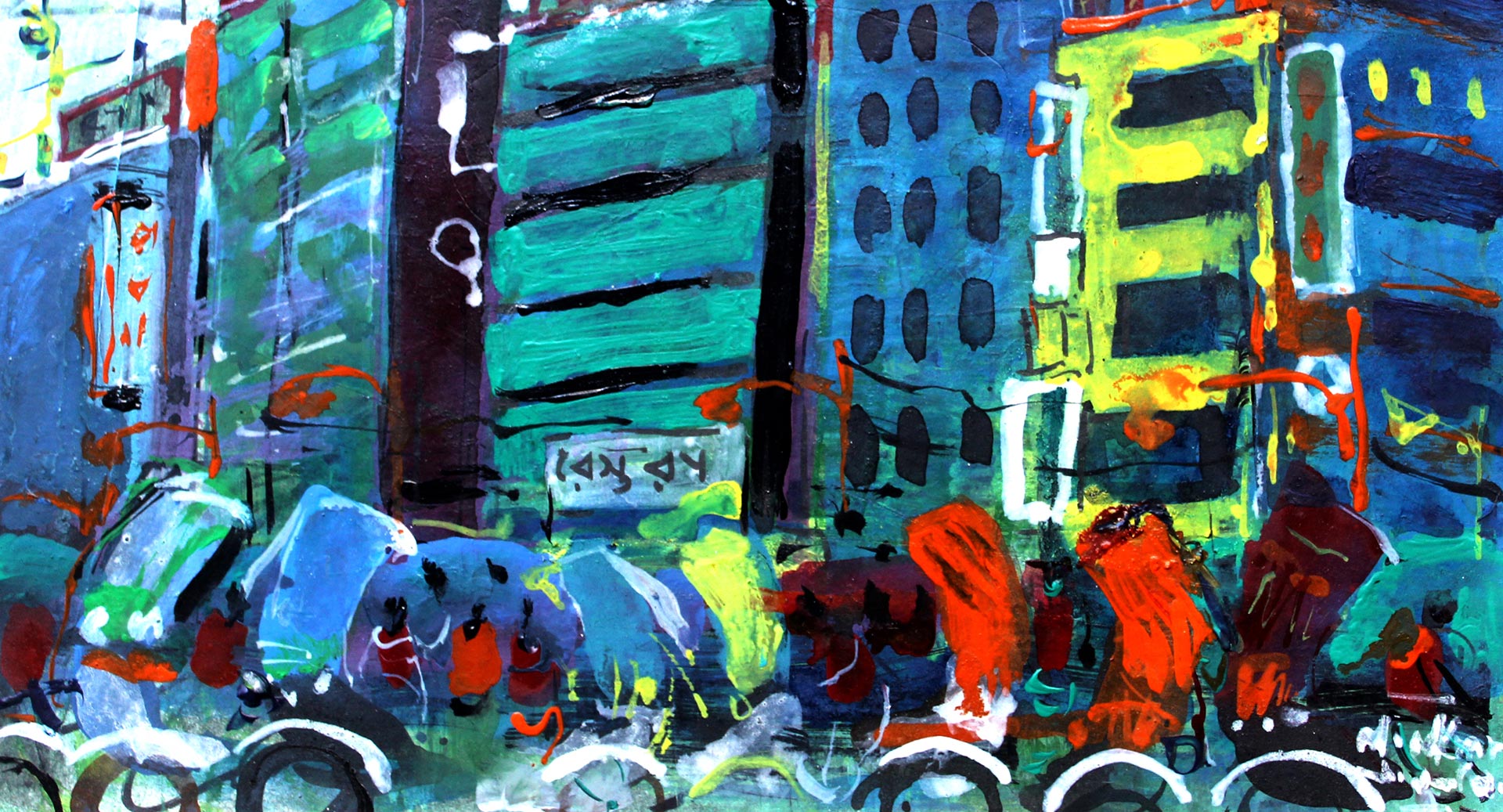 As in the panels of Al Akhir, playful markings of execution reveal the relationship between impulse and restless expression. With a child-like approach, the presence of his persona reflects his striving and quest for authenticity in the exhibition. The craft of picture-making is dispersed from its formal outlook into spontaneous reflection. Akhir’s fragile, broken lines and dotted color specs undergo symbolic transformation through a blending of contrasting colors and casual shakings, echoing the emotional thunder of Dhaka’s inflated chaos. He renders joyful fluidity and carefree anticipation, where his images play with relational layers of realism and abstraction-a transition chasing coherent juxtapositions of wash color, vibrancy, and space. He explores an illustrative aspect of an image, creating an objective presence within a subjectively obscured identity, emphasizing the primary elements of the picture-making process.