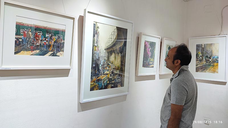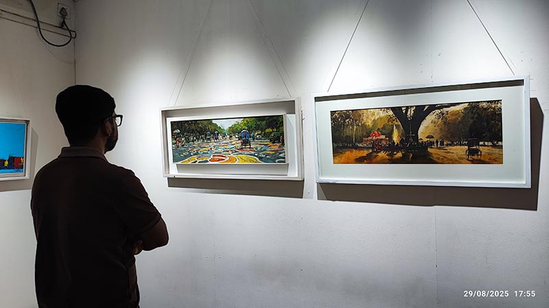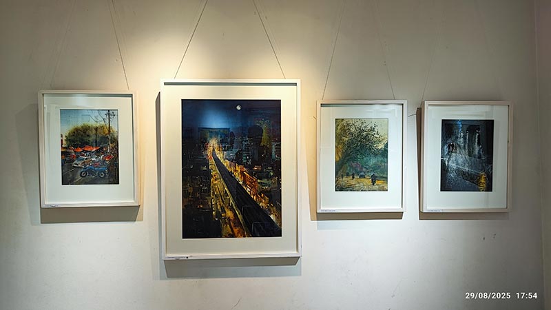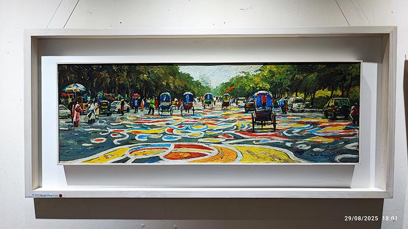 On the other hand, architect-painter Maksud Biplob captures objectified, structured rhythm and urban vibe through intricate, snapshot-like paintings. He distills the city’s visual codes into an academic yet observational language, exploring beauty at the edge of chaos. Some works move beyond imitation into symbolic exaggeration of color, as in ‘Caged Vibrance’, where intense pulses evoke playful urban memories. His watery atmospheres bring fresh, rain-soaked vitality, while pieces like ‘Glass Bird’ fuse ornamental folk motifs with obscured silhouette profiles as a backdrop, creating visual riddles within the urban frame.
