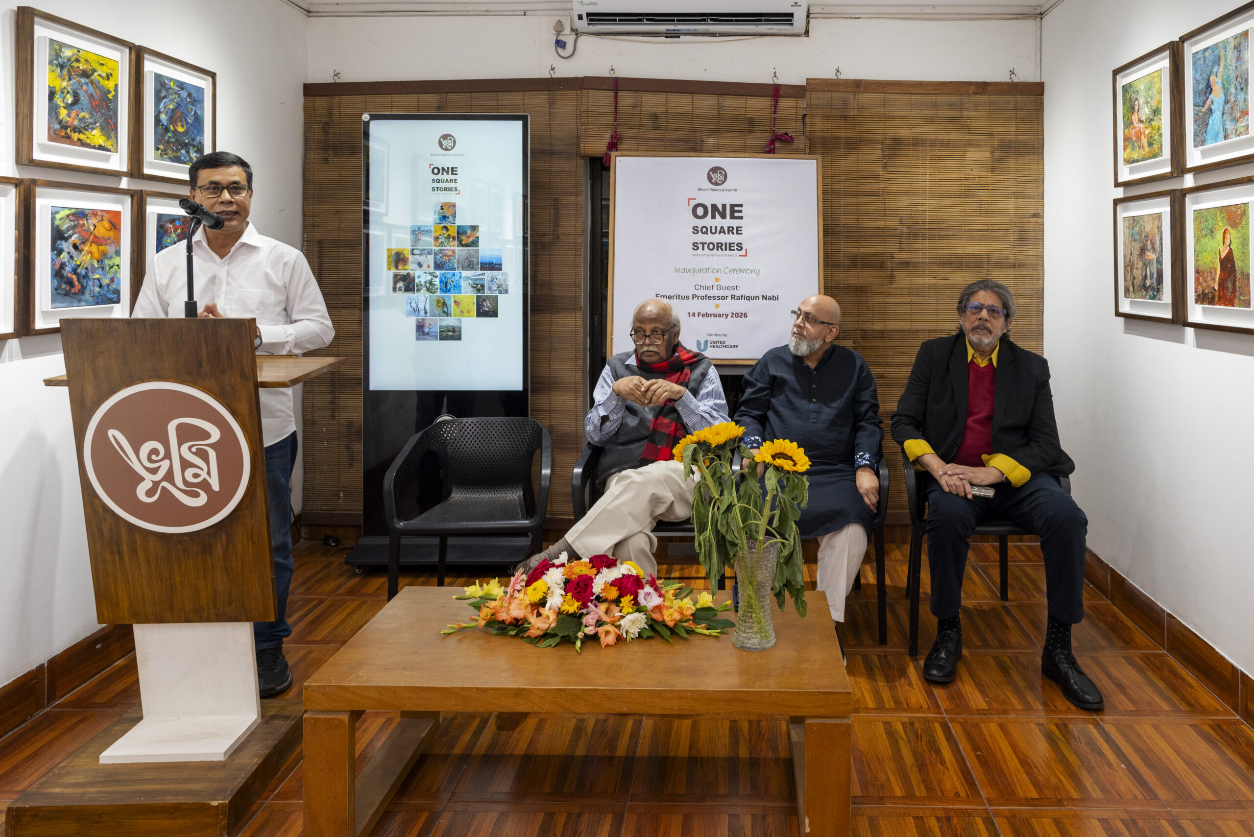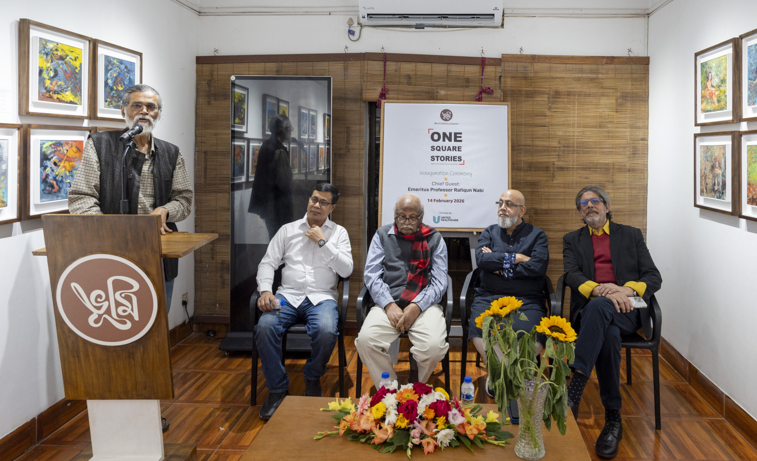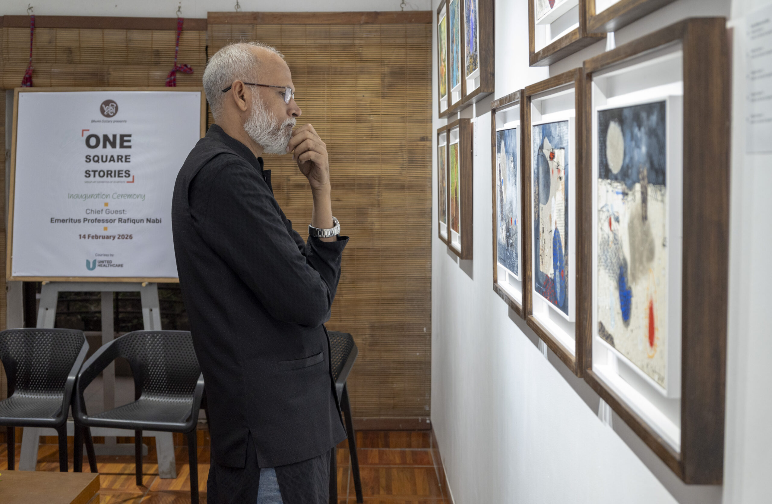 On Saturday evening, 14 February 2026, Bhumi Gallery inaugurated the group art exhibition “One Square Stories”, featuring the works of 20 distinguished and renowned artists of Bangladesh. The opening ceremony was held at Bhumi Gallery in Lalmatia, bringing together eminent artists, guests, critics, and art enthusiasts for a vibrant cultural gathering.