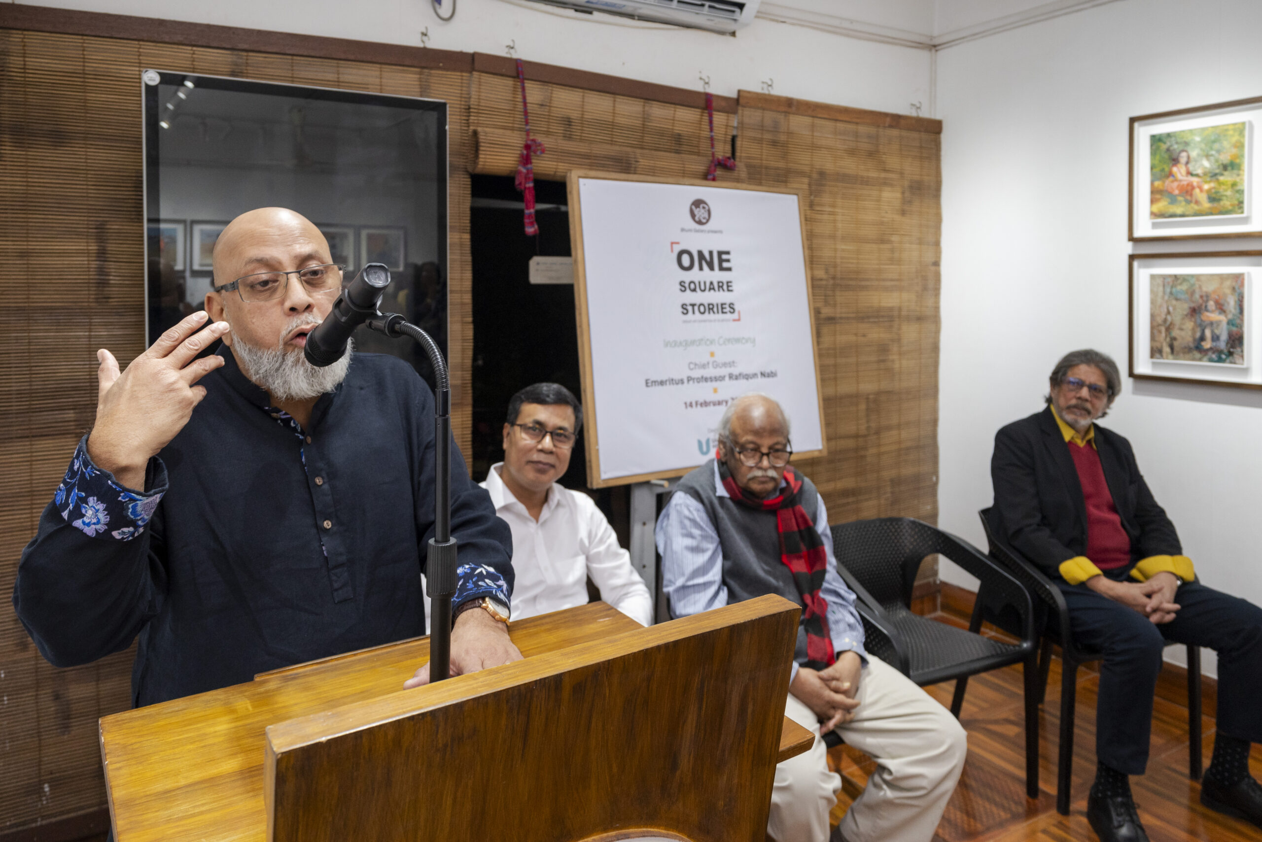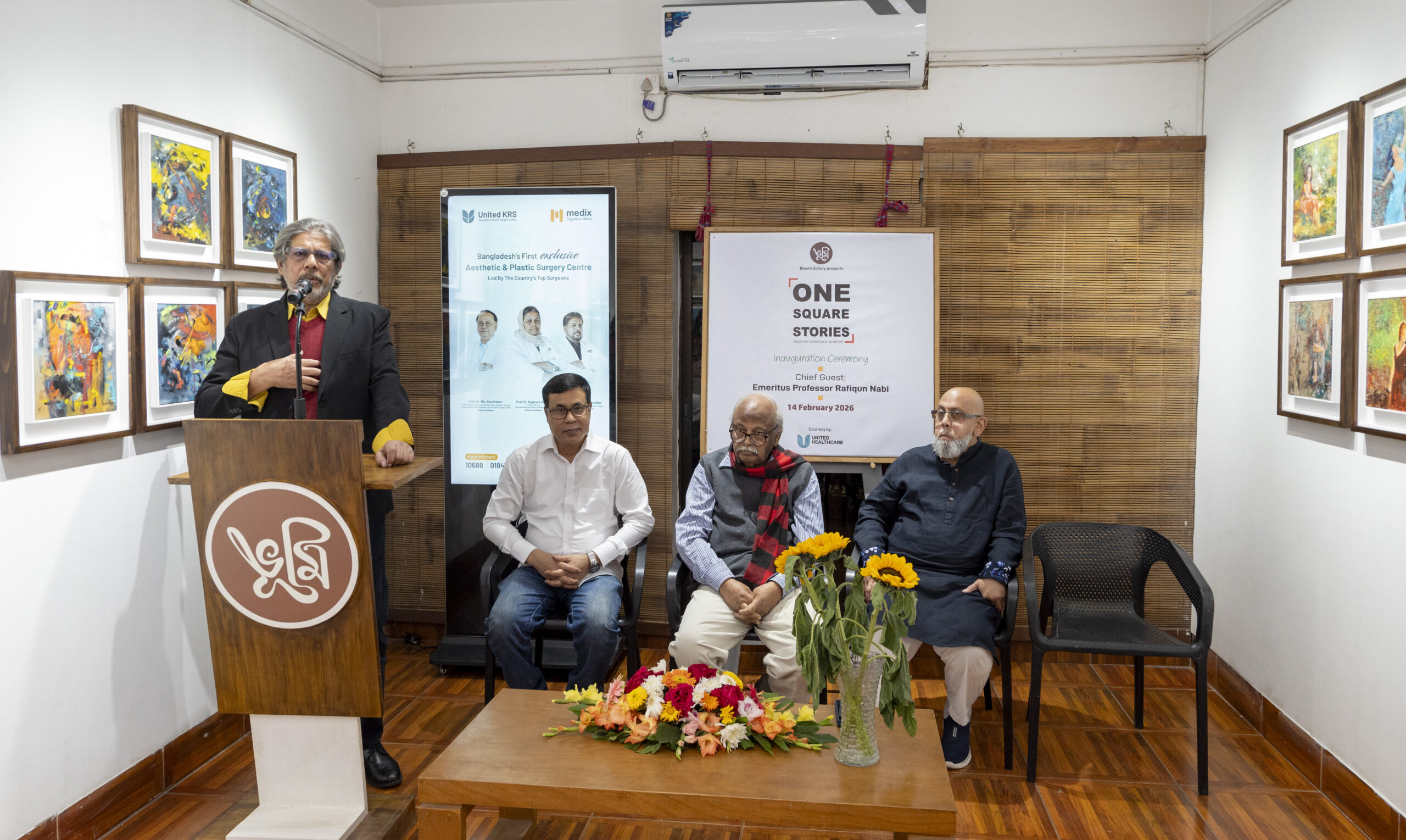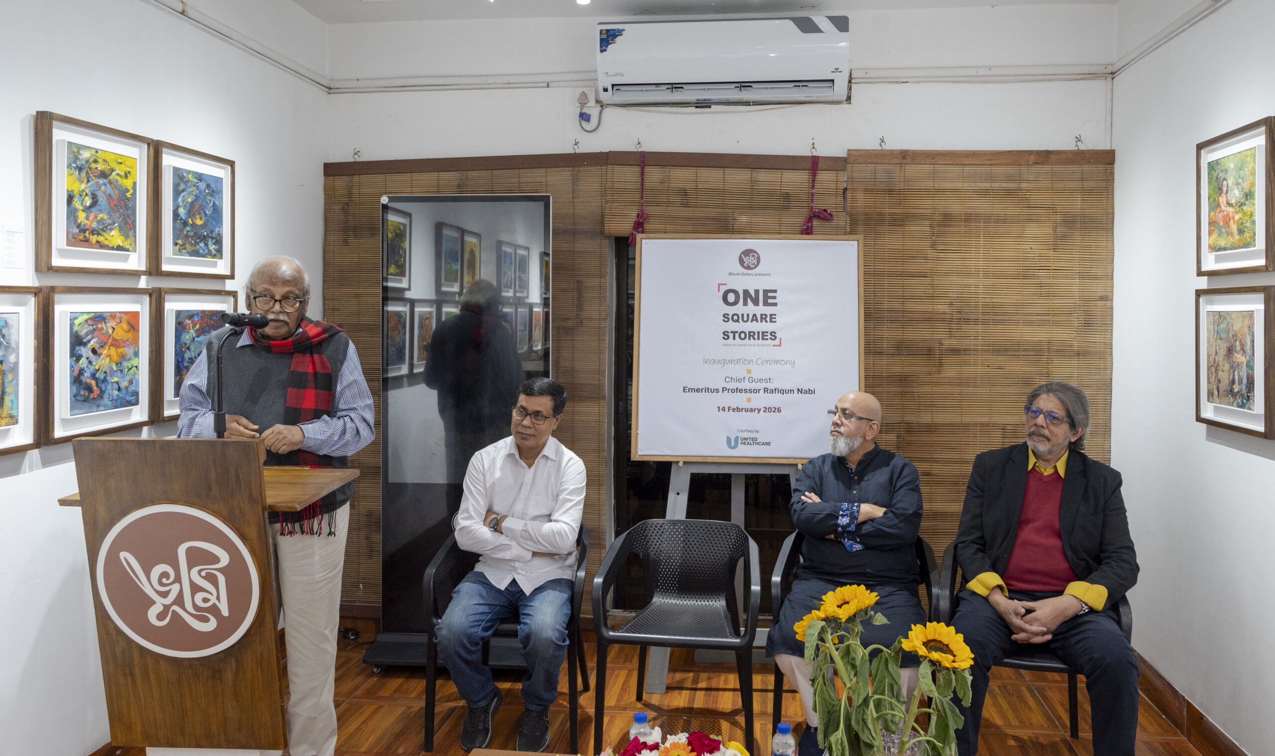 On Saturday evening, 14 February 2026, Bhumi Gallery inaugurated the group art exhibition “One Square Stories”, featuring the works of 20 distinguished and renowned artists of Bangladesh. The opening ceremony was held at Bhumi Gallery in Lalmatia, bringing together eminent artists, guests, critics, and art enthusiasts for a vibrant cultural gathering.